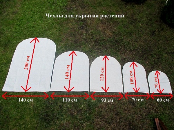 Размеры чехлов для зимнего укрытия теплолюбивых растений: 60х70 см, 70х100 см, 93х120 см, 110х140 см, 140х200 см.