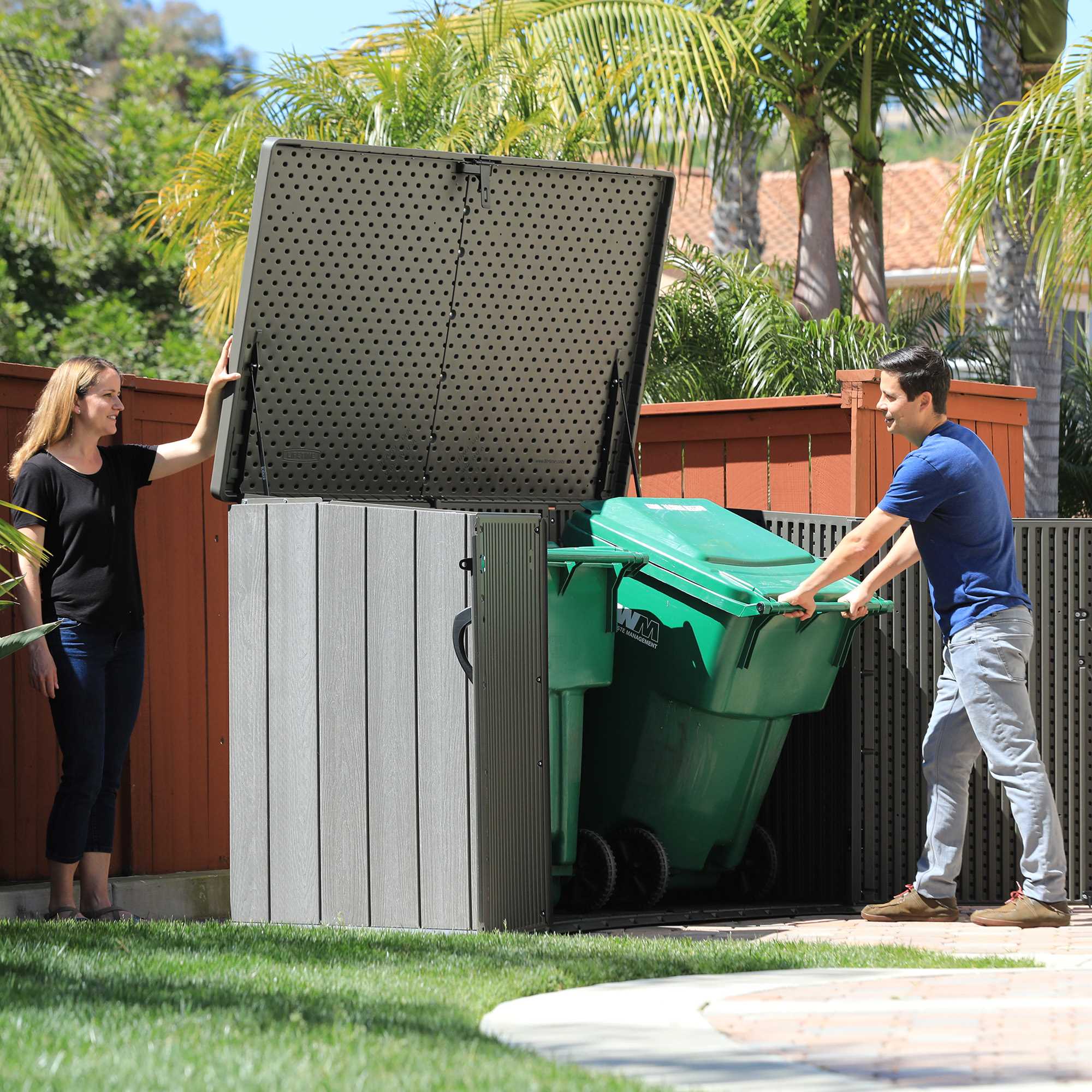 • Безопасность - Ящик для мусорных баков имеет уши, которые позволяют запирать двери на висячий замок. А специальные гидравлические лифты амортизаторы крышки обеспечивают её легкий и плавный подъем и удерживают крышку в открытом состоянии. Крышка не захлопнется даже при сильном ветре